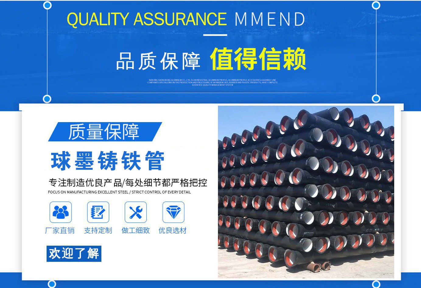 山西飛翔鑄業(yè)有限公司是一家以新興技術(shù)致力于研制開發(fā)、生產(chǎn)、銷售、施工安裝各種球墨管廠家,球墨鑄鐵管價格,國標(biāo)球墨管,k9球墨鑄鐵管,國標(biāo)球墨鑄鐵管,離心球墨鑄鐵管等系列鑄鐵產(chǎn)品。公司擁有完善的銷售、售后服務(wù)體系及一支由鑄造專家、工程師組成的精通產(chǎn)品設(shè)備和生產(chǎn)鑄造的技術(shù)力量隊伍。隨著企業(yè)的發(fā)展,我們積累了豐富的鑄造經(jīng)驗與科技水平。使得產(chǎn)品具有高強度、高韌性、耐腐蝕性強等性能。同時,我們獲得質(zhì)量管理體系認(rèn)證、產(chǎn)品質(zhì)量認(rèn)證、職業(yè)健康體系認(rèn)證、環(huán)境管理體系認(rèn)證。產(chǎn)品暢銷各地并打入韓國、新加坡等東南亞市場。 在未來的發(fā)展中,公司奉行誠信共雙贏,合作創(chuàng)盛世的企業(yè)理念。讓我們一起共創(chuàng)美好未來! 公司產(chǎn)品采用良好的工藝流程,以確保產(chǎn)品質(zhì)量的穩(wěn)定性:以良好的設(shè)備,確保質(zhì)量的可靠性。廣泛應(yīng)用于國內(nèi)外城市的市政建設(shè),通信,自來水,消防,園林,環(huán)保等行業(yè),產(chǎn)品大獲贊譽! 我們有多年的井蓋生產(chǎn)經(jīng)驗,多名老技術(shù)工人有將近二十年的生產(chǎn)經(jīng)驗,還聘請多名新技術(shù)研發(fā)人員,因為我們始終堅信質(zhì)量才是未來生存的根本,只有把質(zhì)量保證了,企業(yè)才會有更加美好的未來。公司堅持用心服務(wù),誠信為本,與時俱進,科技為先的企業(yè)理念,堅持科技先導(dǎo)、竭誠為廣大用戶服務(wù)。歡迎各界朋友蒞臨我公司參觀,指導(dǎo)洽談業(yè)務(wù),相信選擇我們就是選擇我們共贏的明天...